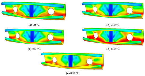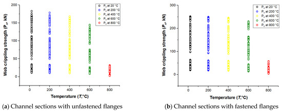 Figure 13 shows the web crippling strength of CHS channels response to a temperature gradient. The ultimate web crippling strength decreases as the temperature rises from 20 to 800 ℃. As shown in Table 6, the drop percentage in the web crippling strength for unfastened-flange channels is larger than that for fastened-flange channels. Figure 14 depicts some selected failure modes using the Von Mises stress criterion. From Figure 14, it is observed that the out-of-plane deformation of the webs occurs under EOF loading. The failure modes are similar for most of the sections at ambient and high temperatures. However, the stress distribution near the web holes increases as temperature increases (see Figure 14). Furthermore, it was found that the web crippling strength of CHS channels decreases with increasing temperatures.