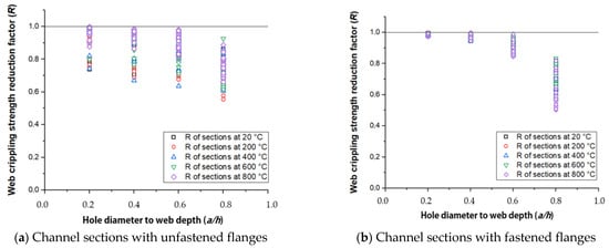 Figure 15 and Table 7 illustrate the relationship between the a/h ratio and the web crippling strength reduction factor (R). Figure 15 depicts a decreasing trend in the R as a result of the increasing a/h ratio. When the a/h ratio grows from 0.2 to 0.6, CHS channels with fastened flanges see a modest variation in the reduction factor when exposed to various temperatures. In Table 7, the average R value for CHS unfastened channels reduces from 0.95 to 0.75, with an increase in a/h ratio. Similarly, the average R value for CHS fastened channels decreases from 0.99 to 0.73.