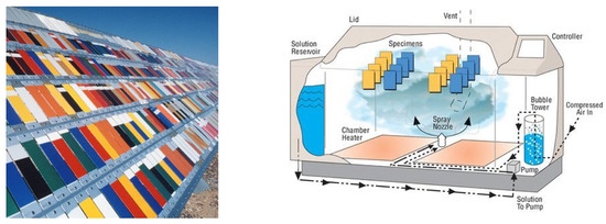 Outdoor weathering rack (left) and a salt-spray tester (right) [17,18].