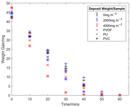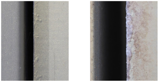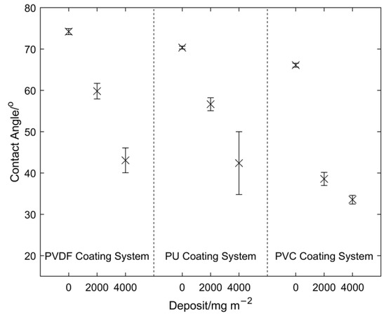 In this work, the effect of natural deposit build-up was examined on a number of commonly used organic coating systems for steel cladding, namely a PVC-based system, a PU-based system, and a PVDF-based system. Samples 5 cm × 5 cm in size were used to create the fouled samples; 5 and 10 mg of building deposit was added to each sample to give two samples with a deposit coverage of approximately 2000 and 4000 mgm−2, respectively. The deposit was dissolved in approximately 5 mL of deionised water and was pipetted onto the sample and allowed to dry on a hot plate at 50 °C. This produced visually similar fouling to that observed on the actual building, as shown in Figure 5. To ensure this process did not affect the results, the clean samples also went through the same procedure of water addition and heating.