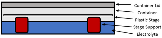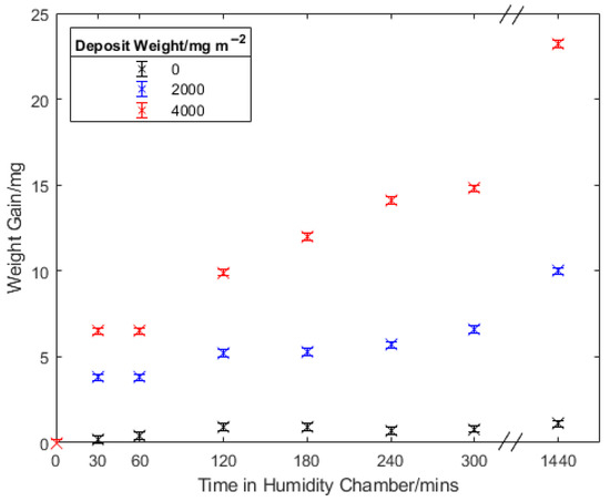 The moisture retention of the fouling deposit from localised microclimates was considered to be a possible contributory factor in the degradation of the OCS. An experimental method was developed that allowed for this to be investigated in the laboratory by placing fouled samples in a controlled humid environment, Figure 6. This was composed of a sealed tub partially filled with a 5 wt.% NaCl electrolyte to maintain a humidity of 95%. The samples were placed on a plastic stage that was supported and held out of the electrolyte by using plastic supports. The three samples of each coating system with deposits representing 0, 2000, 4000 mg m−2 were first weighed and then placed in the chamber. They were then removed and reweighed periodically to measure weight change as a result of moisture absorption onto the surface. After the final weight was recorded, the samples were also photographed to allow visual observation of any changes.