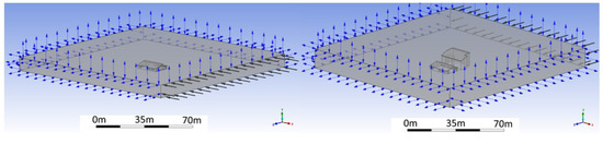 The computational domain is shown in Figure 10 and had the following boundary conditions set: the upper face ‘sky’ boundary was set as an opening with 0 Pa relative pressure with random injection of water particles from approximately 600,000 injection regions. The inlet location varied depending on the desired wind direction for each test; however, each inlet was defined to have a normal air velocity varying from 2 to 12 ms−1, representing a range of local wind conditions (Table 2). All other boundaries were set as smooth walls with a restitution and parallel coefficient of 0 to draw attention to the areas that rain impacted the building, i.e., when droplets hit the surface, they stick, and their path is considered ended. No consideration was given to the droplet’s formation on the surface or the subsequent dripping through the action of gravity. The droplet flow rate was such that total droplet volume represented the annual rainfall. All other boundaries were set as smooth walls with a restitution and parallel coefficient of 0 to draw attention to the areas that rain impacted the building.