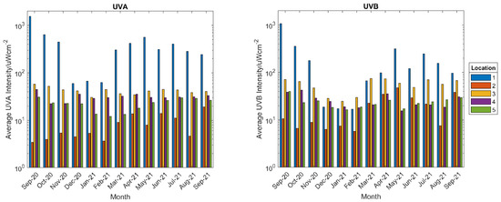 Comparison of UVA (left) and UVB (right) intensity recorded at each location.
