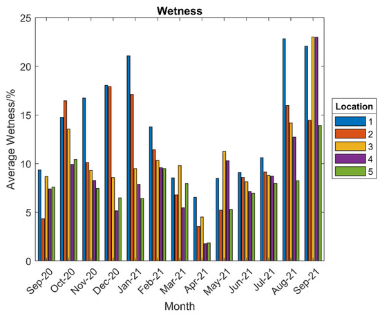 The measured humidity at each site, shown in Figure 14, shows much more variation among locations. Of particular interest is the difference between those locations that are high up in the eaves and are considered sheltered locations (2,5) and those lower down, which are far more exposed to the elements (1,3,4). Although there was some variation, on average these high locations recorded 4–5% increased relative humidity during the test period.