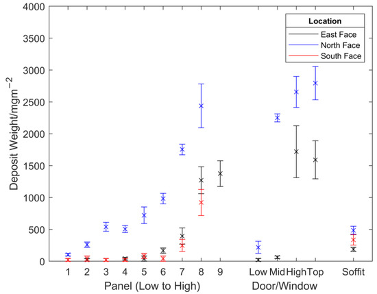 It was shown that significant variations in the degradation of steel architectural cladding can be experienced around a building, and that this caused by the formation of microclimates due to building geometries. Regions separated by less than 30 cm can experience significantly different degradation. What was observed in this work builds on research claims [20], that it is the more sheltered regions of the building that often receive far lower exposure to rain and sunlight, which appear to show the greatest levels of degradation. These regions generally only experience high levels of a single conventional aggressive condition—humidity; however, in the present example, it appears that OCS performance is more highly correlated with the build-up of natural fouling deposits than any other measured factor. Significantly, even regions with relatively similar humidity levels show vastly different levels of degradation when the amount of deposit is varied. Natural deposits (although usually only specifically pollutants) have been shown previously to be key accelerators of degradation for façades of other construction materials, such as paint, concrete, and ceramic [24,36,37], but have often not been examined or measured in great detail as factors when comparing discrepancies between natural and accelerated weathering of OCS [4,38].