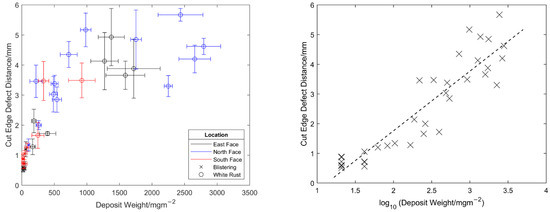 In order to measure the quantity of degradation across the classroom, a number of steps were involved with the first being a close visual inspection of the building. From this it was determined that generally the coated cladding was performing well and, in fact, the only sign of degradation was at the cut edge. This was to be expected as modern organic coatings are unlikely to experience thorough coating failure within 6 years following the building’s construction, and cut edge corrosion is one of the most common routes of degradation for organically coated cladding [27]. Hence, the parameter measured to ascertain the degree of degradation was simply the distance from the cut edge that degradation had occurred. Measurement was carried out using digital callipers across a number of panels on each accessible façade of the building at different heights and locations, such as an alcove. The type of cut edge degradation was also noted with both blisters and white rust observed (both shown in Figure 3). Blisters are considered an early stage of cut edge coating degradation, whereas white rust is indicative of more severe metal substrate deterioration. At paint blister locations, water had penetrated the organic coating/metal interface and had reacted with the galvanised zinc surface causing a delamination separation of the metal and organic paint. This can ultimately lead to white rust formation when the zinc on the underlying galvanised metal surface is oxidised to zinc oxide.
