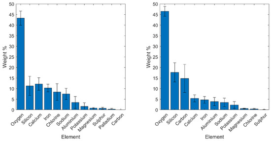 The solid particles obtained via the collection methods were characterised using energy dispersive spectroscopy (EDS) in a Hitachi TM3000 Desktop scanning electron microscope (SEM). For each sample, three different areas were examined and an average atomic weight % calculated from these results. As there were a number of particle sizes, the three areas chosen covered a variety of particle sizes and shapes. Further analysis to determine the chemical constituents of compounds present was carried out using X-ray diffraction (XRD) [32].