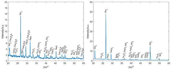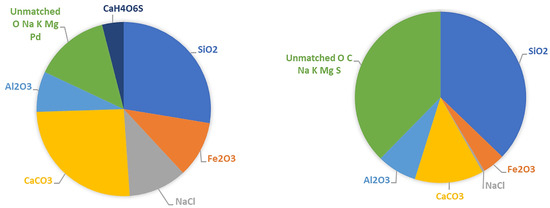 In order to analyse the composition of the deposit, 5 cm × 5 cm 4-ply nonwoven sterile swabs were used to collect a significant amount of matter from the building whilst wearing nitrile gloves. The gauze was placed in 200 mL of deionised water for approximately 2 days to ensure any absorbed matter was removed. After the two days, the gauze was removed using plastic tweezers and examined to ensure that the deposit had been removed. The gauze was wrung and left to dry to allow any further matter to be extracted. The resulting solution was passed through filter paper. This filter paper was removed and placed in a Petri dish on a hot plate at 50 °C for approximately 3 h to dry the powder. The powder was then collected and placed in a clean sample box. A separate swab was taken of the building and this swap was dried in a similar manner and the dry powder was then scraped off the gauze into a clean sample box. This gave two lots of dry powder for examination, one that should have any soluble components removed (P, particulates) and the other as was found on the building façade (SP, soluble compounds, and particulates).