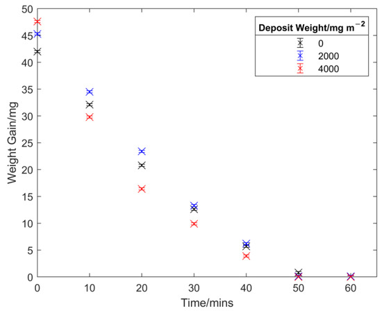 In order to measure the effect of deposit presence on the retention of water and the drying rate of the laboratory-fouled samples, each sample was weighed and then nine 5 µL drops of deionised water were placed on the sample, as shown in Figure 7. The samples were left at room temperature and reweighted every 10 min until the weight of the sample returned to that of the original state. The weight of water present on the samples was then calculated for each time step.