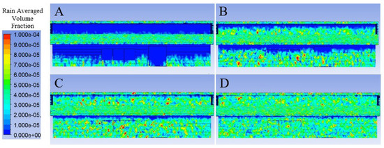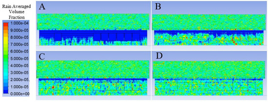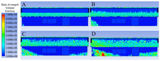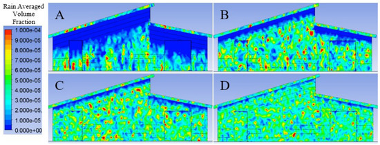Predicted rain impact density for the north elevation under 2 (A), 4 (B), 6 (C), and 8 (D) ms−1 wind speed applied normal to the north elevation.
