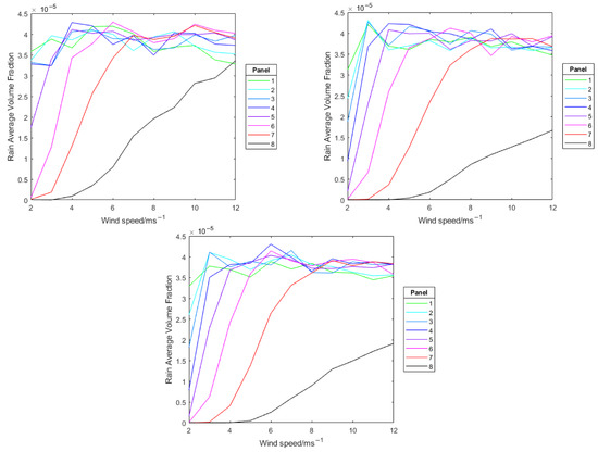 The measured average rain volume fraction for each location identified in Figure 11 can be seen in Figure 31. This provides further evidence to corroborate the visual observation that the roof soffit provides a sheltering effect that decreases with increased wind speed. It is also apparent just how significant that sheltering effect is on the higher panels (6–8), suggesting a very low probability of direct rainfall contacting these panels unless a high normal wind speed is present.