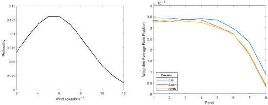 Wind-speed probability distribution used (left) to calculate wind-speed weighted averaged rain fraction for each panel on each façade (right).