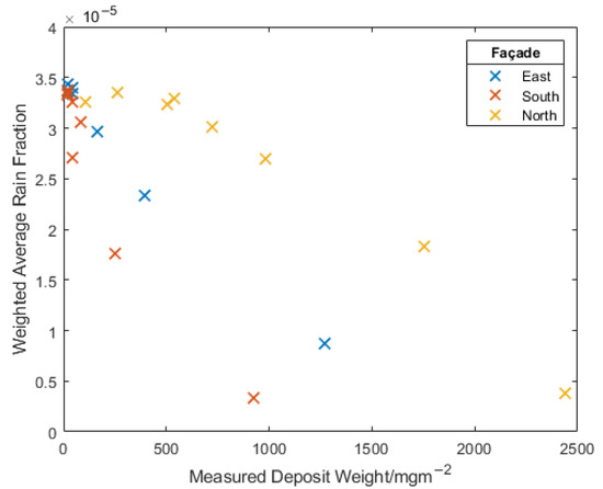 When this value was plotted against the measured deposit fouling, Figure 33, the results show that, as expected, the extent of fouling increases as the quantity of model-predicted rain impact decreases. While the east and south faces generally show similar behaviour, the north face, however, is observed to show far greater fouling for a similar weighted average rain fraction. It is thought this is due to the importance of considering other nearby buildings on the effect of natural building washing and not solely the geometry of the building of interest.