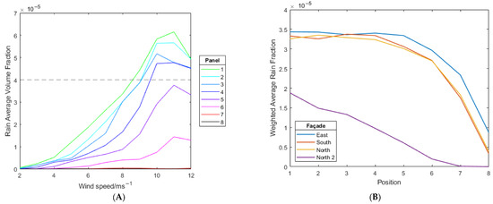 It is observed in Figure 35 that with the adjacent building included in the model all the panels on the north façade record far lower averaged volume fractions of rain at the lower wind speeds (2–8 ms−1). In fact, it is observed that a wind speed of 8 ms−1 is required just for panel 1 to receive a similar rain average volume fraction to panel 1 in the single building model at just 2–4 ms−1. While panels 1–4 do experience slightly higher volume fractions at high wind speeds 8–12 ms−1, it should be noted that panels 5–8 never record similar volume fractions to those in the single building model, even at high wind speeds. This difference in the predicted north façade rain impact density in the two models is further shown by the wind-speed weighted average rain fraction, also shown in Figure 35.