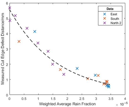 While it is promising to see a clear correlation between the simulations and the deposit fouling intensity, the far more important factor is the measured distance of the cut edge corrosion defect. The result of plotting this against the wind-speed weighted average rain fraction for all façades and panels, Figure 37, is a highly correlated exponential trend between the two factors, providing an R2 value of 0.94. The exponential decay of the cut edge defect distance with simulated rain fraction was thought to be explainable through the effect of cleaning and therefore the relative influence of deposits. As the rain impact density increases, the fouling decreases, which leads to an ever-smaller contribution of the fouling deposit to the degradation. This suggests the simulations could accurately be used to determine likely areas of concern.