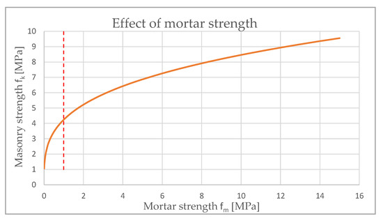 Effect of the mortar strength on the masonry load-bearing capacity according to Equation (1) [1]. Red dashed line highlights the level of compressive strength of 1 MPa.