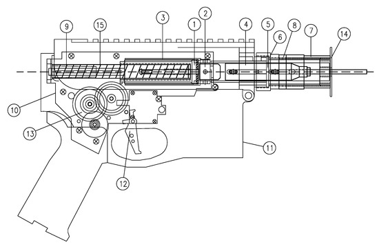 Composition of the proposed device. It consists of the mechanical box of an air-soft gun and additional parts designed for diagnostic purposes. 1—piston; 2—hammer; 3—cylinder; 4—indenter; 5—bearing core; 6—bearing nut; 7—support; 8—arrest nut; 9—spring guide; 10—gearbox; 11—M4 metal body; 12—trigger; 13—gear set; 14—support plate; 15—spring.