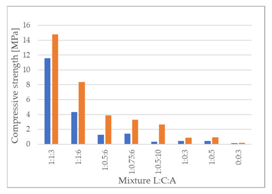 Influence of the absorption effect. Blue values were obtained from the specimens laid in the steel mold and the orange values were influenced by the absorption effect of the bricks.
