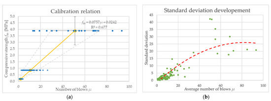 Figure 6a shows the relation obtained from the results of three pairs of piers with different mortar strength averages. The first mortar had 0.17 MPa, the second pair had 0.85 MPa and the third had 3.89 MPa. There are signalized standard deviations for the number of blows needed for the 5 mm penetration and also for the mortar’s compressive strength. The area of the standard deviation is bound by a dashed line. The middle orange line is a curve that was constructed by averaging the results obtained for each mortar type. The curve is almost linear and can be expressed by the following equation: