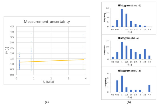 For Equation (3), the coefficient of determination R2 = 0.677 was manually calculated and it was very low due to the high variations of the destructively determined mortar’s compressive strength. Therefore, there was not possibility to separate the variability of the method and the variability of the basic material. The deviation of the measured results for each specimen is described in Figure 7a,b. It is characterized by uncertainty calculated as . The basic dispersion parameters of uncertainty are shown in Table 3. Compared to the other NDT methods mentioned in the introduction, the variability of the results is very high. The coefficient of determination (R2) of R. Nogueira’s drilling method, tested on the mortars, ranged 0.9–10.6 MPa, and it was stated as R2 = 0.9 [8]. It the article of D. Łatka, describing another penetrometric method, R2 was not mentioned but the differences between the DT and NDT measurements were from 4% to 27% [14].