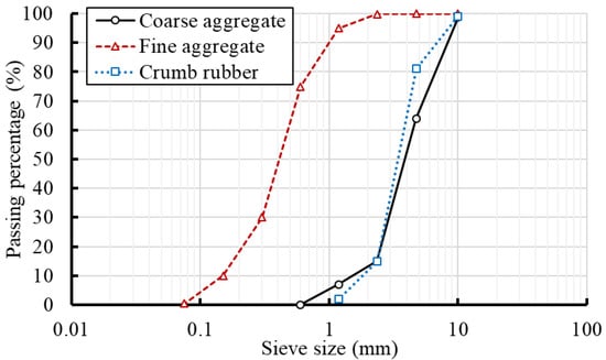 The concrete mix ratio between cement: fine aggregate: coarse aggregate of the reference mix (C-0) was 1: 1.6: 2.7. The water-to-cement ratio used was 0.5 for all concrete mixes. Ordinary Portland Cement that meets ASTM C150/C150M-20 [] with a unit weight of 3150 kg/m3 was used. Sand with a specific gravity of 2.6 was used to prepare the concrete mixes. Gravel interlocks with a nominal maximum size of 10 mm and a specific gravity of 2.65 were utilized. Sieve analyses of the aggregates used were performed, as presented in Figure 1. The rubberized concrete mixtures were made by partially substituting the coarse aggregate with recycled CR. The replacement ratios of rubber used were 5% (RC-5), 10% (RC-10), 15% (RC-15), and 20% (RC-20) of the volume of gravel (see Table 1).