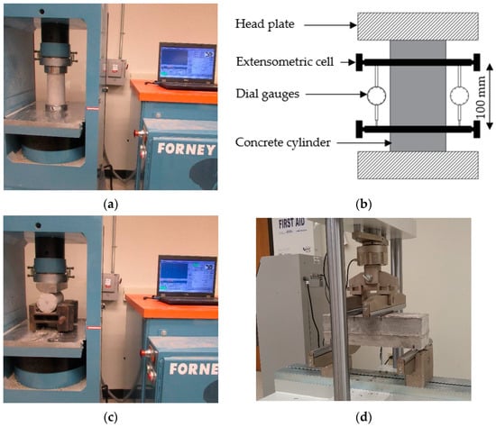 Types of equipment for compression, splitting, and flexural tests. (a) Uniaxial compression tests. (b) Axial strain measurements. (c) Splitting tests. (d) Flexural tests.