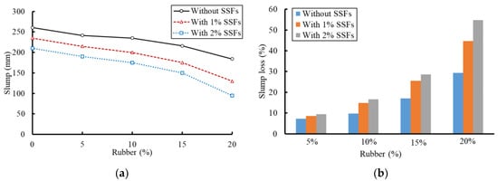 Slump tests were achieved according to ASTM C143/C143M-15a [] to explore the fresh-state behavior of the rubberized concrete mixes. The slump test results were between 95 mm and 260 mm (see Figure 6a). Increasing the CR content caused a reduction in the slump reading. This low workability of rubber-based concrete was due to the hindrance in the movement of concrete ingredients by rubber particles and the lack of adhesion between the cement paste and rubber particles. These results confirmed that the rubber-based concrete mix needs a higher water/cement ratio than normal concrete to coat the CR particles and ensure enough free water to accomplish cement hydration []. The percentage slump loss factor is calculated using Equation (1) as follows:
