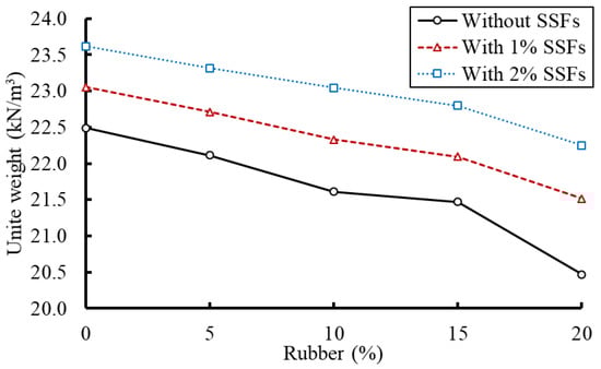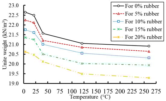 - The unit weights of the rubberized concrete were reduced when the temperature increased, and this reduction decreased as the CR content increased. The mixture containing 20% CR displayed the lowest effect of temperature on the unit weight of the rubberized concrete.
