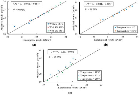 Regression between the experimental and analytical values of the unit weight. (a) Case of rubber content. (b) Case of rubber content and temperature (3 °C ≤ T ≤ 21 °C). (c) Case of rubber content and temperature (T > 21 °C).