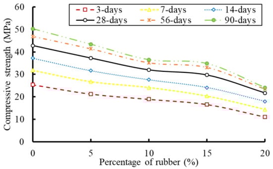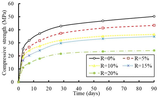 Effect of the concrete age on the compressive strength of concrete with different CR content ratios.