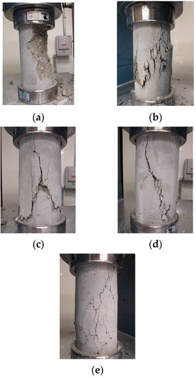 Modes of failure of concrete specimens with different CR contents. (a) 0% content of CR. (b) 5% content of CR. (c) 10% content of CR. (d) 15% content of CR. (e) 20% content of CR.