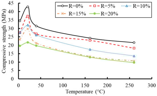 Figure 8 depicts the influence of temperature on the unit weight of rubberized concrete at the age of 28 days. The unit weights of the rubberized concrete were reduced by 7.6%, 7.2%, 6.8%, 6.6%, and 6.5% when the temperature increased for the concrete mixtures with CR content of 0%, 5%, 10%, 15%, and 20%, respectively. The mixture containing 20% CR displayed the least influence of temperature on the unit weight of the rubberized concrete when the temperature was less than 40 °C. However, the effect of elevated temperature on concrete with 20% CR became more pronounced after 40 °C. There was a slight increase in the mass losses of concrete with 20% CR compared to the other mixtures. Early mass loss was caused by the evaporation of free capillary and physically bounded moisture and the partial dehydration of the chemical compounds of the cement matrix []. Additionally, the decomposition of CR particles at elevated temperatures and the formation of voids in concrete due to the decomposition of these particles contributed to these reductions in unit weights [,]. The CR particles melted at a temperature of around 170 °C, which contributed to greater reductions in the unit weight due to the mass loss of the CR.