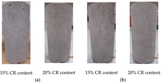 Serious damage to the concrete surface of specimens with 15% and 20% CR contents due to exposure to elevated temperatures of 121 °C and 260 °C. (a) For a temperature of 121 °C. (b) For a temperature of 260 °C.