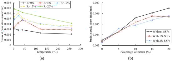 Strain at peak stress. (a) Effect of temperature. (b) Effect of SSFs.