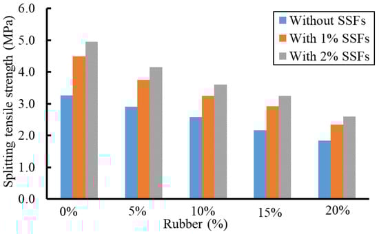 - Reductions in the splitting tensile strength were observed after increasing the CR content. The tensile strength decreased by 11.1%, 20.7%, 33.5%, and 43.5% for CR contents of 5%, 10%, 15%, and 20%, respectively. However, using SSFs in the concrete mix enhanced the indirect tensile strength by 29.2% and 43.1% when the percentages of SSFs increased from 1.0% to 2.0%, respectively.