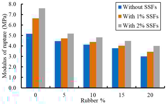 Conversely, the stiffness and compressive strength of the rubberized concrete specimens improved with the addition of SSFs. The improvement was enhanced as the percentage of SSFs increased, as shown in Figure 12. The SSFs were uniformly distributed and randomly oriented to arrest the micro-cracking mechanism and limit crack propagation.