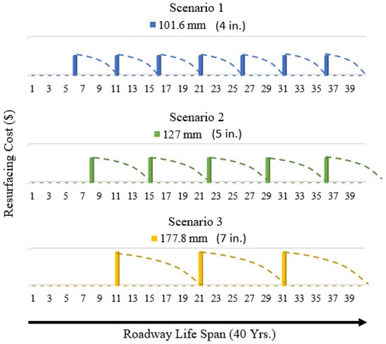 Three scenarios, as listed in Table 2, are developed to compare the life cycle cost of rubberized concrete with the life cycle cost of ordinary concrete for roadway TWT application. Several research studies have illustrated that rubberized concrete mixtures offer a higher service life compared to ordinary concrete mixes. For instance, Liu et al. [] confirmed that the toughness and cracking resistance of the concrete increased with an increase in rubber content (up to 20%) in the mixture. Moreover, the fatigue life and dynamic strain of rubberized concrete were better than those of ordinary concrete under certain stress levels []. Feng et al. [] showed that adding CR to concrete mixtures enhanced the deformation capacity and crack resistance of the concrete. In this study, the same life spans are assumed for ordinary concrete mixtures and the rubberized concrete mixtures in the LCCA. A life span of 40 years is assumed for the roadway structure.