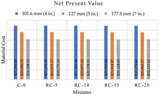 Figure 28 illustrates the NPV of all concrete mixtures for the three scenarios. Comparing all the NPVs for different scenarios shows that using rubberized concrete mixtures for TWT offers slightly lower NPVs compared to the ordinary concrete mix. Among the rubberized concrete mixtures, RC-20 offers the lowest NPVs (i.e., $27,179.60, $23,903.57, and $20,315.60) for all three scenarios (i.e., 101.6 mm, 127 mm, and 177.8 mm) due to having higher percentages of CR as a cheaper aggregate substitute in the mixture. Comparing the scenarios reveals 177.8 mm (7 in.) is a cost-efficient option for TWT at this location. It is noteworthy to mention that only material costs were considered in this study. The benefits of using rubberized concrete are beyond the cost of materials. Rubberized concrete offers several advantages over ordinary concrete. The unit weight of rubberized concrete was lower than that of the ordinary concrete mixture. This can increase labor productivity in handling the mixture. Rubberized concrete also provides excellent freeze–thaw durability compared to ordinary concrete mixtures []. The improved fatigue life of the rubberized concrete relative to conventional concrete makes the rubberized mixture a better solution for roadway applications. Finally, rubberized concrete mixtures have fewer negative environmental impacts compared to ordinary concrete mixtures.