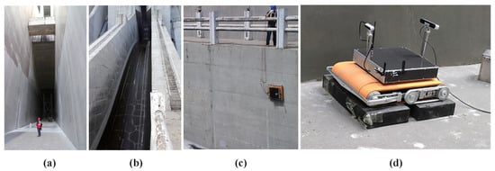 Field testing environment at Three Gorges Dam. (a) deep spillway, (b) drift spillway, (c) robot scanning on a vertical surface, (d) climbing robot.
