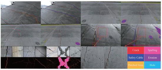 Sample images from DSI dataset combined with CSSC dataset. The first two rows are the dam surface multi-defect dataset we collected. Contains crack, patched area, erosion, spot, rope categories, and the two rows in the lower left corner are CSSC datasets, including crack and spalling defect data.
