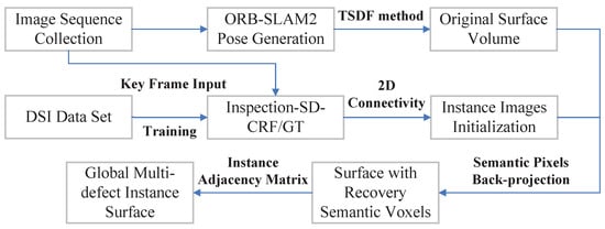 Pipeline of our algorithm.The algorithm is divided into two parts. The sequence images collected by the wall-climbing robot are selected to establish the DSI dataset, and then the deep neural network model is trained. The 3D reconstruction uses the keyframe and pose data of the sequence images to obtain an initial set of surface voxels through the TSDF method. Then, using the principle of connectivity, the semantic image output is initialized as a collection of instance images of different defects. Finally, the back-projection method and the adjacency matrix are applied to restore and fuse the instance voxels.