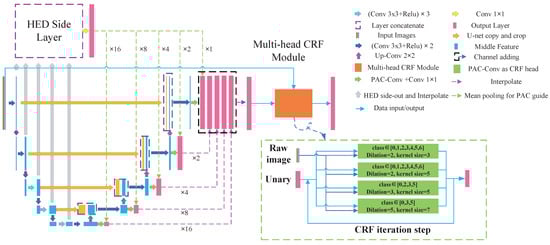 Since we need to perform subsequent pixel-to-voxel semantic 3D reconstruction, and the multi-defect detection frame labeling is too complicated, we did not choose to use the method based on Mask-Rcnn. For the emerging Transformer model its performance on large-scale semantic segmentation dataset is outstanding, but it requires a large amount of data for training. We currently do not have many concrete surface multi-defect semantic segmentation samples in the dataset, as it is mostly a small-sample dataset. Currently, the most defect-ridden segmentation using Transformer is crack defect data because there are many datasets of cracks. In the model selection of U-Net and Deeplab, our dataset contains the feature that the smallest defect type spot can reach one pixel. The dilate convolution may not be able to describe such a small pixel feature at a multi-dilate level. Hence, we choose the classic multi-level model U-Net as the base model for improvement. However, in the up-sampling process, U-Net and Inspection-Net adopt the cascading method from encoder to decoder. This method can maintain multi-scale encoding features, but the convolution scope of the channel space is fixed. For the segmentation of multi-scale defect categories, this is not conducive to learning features of different scales in each layer. We make three improvements to the neural network called Inspection-Net [] and modify its architecture as shown in Figure 4 to solve the problem of scale difference between multiple defect classes. The original architecture of Inspection-Net is a combination of holistically-nested edge detection (HED) [] and U-shape network [] decoder, as shown in Figure 4. Our modifications are: first, we perform 1 × 1 convolution on the output of the HED to obtain the segmentation result; second, the result through multi-level pooling is used as the guide layer of the PAC [] to guide each level of the decoder to output the segmentation results of the corresponding size. Results are interpolated into the original input size and weighted according to the learnable ratio as the coarse output; third, we introduce CRF layers in the MH module to optimize each head’s class iteratively using different kernel settings. Finally, we combine MH output as the final segmentation result.