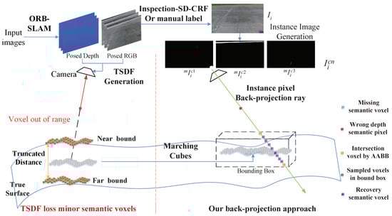 We propose a keyframes back-projection approach to restore the labels of instance pixels on the surface of the 3D mesh. The key idea is to reproject all defect instance pixels of keyframes to the 3D mesh model that is already constructed. The specific operation of the algorithm is shown on the right side of Figure 6. First, extract the bounding box of the TSDF voxel set. At the same time, each keyframes is initialized to a group of class picture sets . represents the index of classes other than background. represents a set contains instance pictures in the class n of the keyframes i. The pixel p in takes the value either m or 0 to represent the instance index or background. Then, we calculate the direction set of rays corresponding to each defect instance pixel in . After that, we calculate two points of each ray intersecting with by the axis-aligned bounding box (AABB) method. Then, use the ratio of the longest intersection line segment and actual voxel size to determine the number of sampling voxels . Finally, according to , calculate the sampling voxel set for . After obtaining , we remain the intersection of and the surface voxel set for each instance image , and finally update the ’s attributes using ’s attributes contained in all .