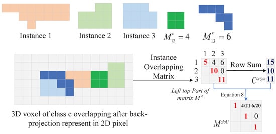 Figure 7 illustrates how to convert 3D voxels overlapping to the matrix element. We proposed the instance overlapping matrix which is an upper triangular matrix. represents the number of overlapping voxels between instance i and instance j(). After each back-projection procedure, we update the voxels’ attributes , , and . When new voxel instance replaces old instance by Equation (7), we can calculate using the principle illustrating in Figure 7. Then, the overlapping IoU matrix is generated by Equation (8) to represent the intersection over union between updated instance i and j. Next, by setting the threshold of 3D IoU for different classes, the adjacent instance matrix of the class is obtained (see Equation (9)). indicates whether each instance number i, j as a vertex in graph theory is connected. Finally, the connected instances are merged and fused to one instance to improve the consistency of instance reconstruction.