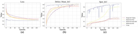 Training result comparison of different models. (a) The training Lovasz loss value (directly related to IoU), (b) defect mIoU, and (c) spot IoU changes during training are compared.