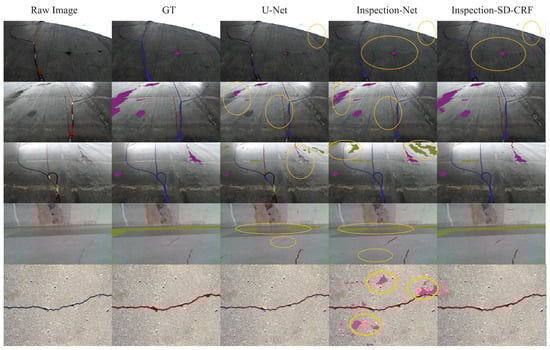 Figure 9 shows the effect of segmentation using different methods on sample images from DSI and CSSC dataset, where the colors of different classes use the same color definition in Figure 2. The orange ellipse shows the details between different model results and ground truth. Inspection-SD-CRF’s result is closer to ground truth. The last row shows Inspection-SD-CRF has less of an area of green coloring(spalling) which means it can avoid the wrong spalling segmentation from the background by considering original image information. On the fourth row, it indicates that Inspection-SD-CRF can segment a more complete patched area and crack classes than other models do. The first three rows show that Inspection-Net has big spots in its segmentation results, while our model can obtain more detailed spot and erosion results. Adding the CRF method can make the model further consider the original characteristics of the pixels around the small class. Therefore, CRF structure can reduce the excessive redundancy of the spot class segmentation results and greatly improve the IoU of the spot class.