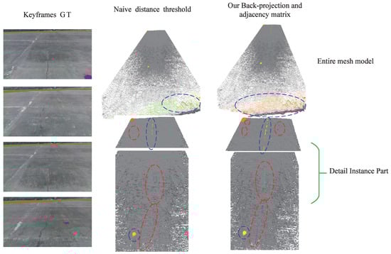 In Figure 10, the mesh models (Naive distance TSDF and our back-projection with adjacency matrix method) use GT keyframes to reconstruct the semantic environment. The blue dotted circles in second row indicate that crack instances of naive distance TSDF method are scattered with five colors (orange, yellow, green, light green, and red), while our back-projection method fuses most overlapped crack instances together as three crack instances (yellow, orange, and green). The first row and third row blue circles indicate that our approach can also fuse the patched area and surface erosion defects. The red dotted circles show the class voxels recovery of two methods. The naive distance method produce sparse small defect voxels registration, and the back-projection method on the right side recovers much more spot and crack voxels.