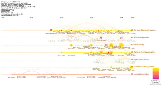 - Construction Stage (construction): cluster #0 ‘building information’, cluster #2 ‘digital twin technology’, cluster #4 ‘integrated life-cycle analysis’, and cluster #13 ‘green building information modeling lifecycle’;