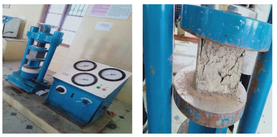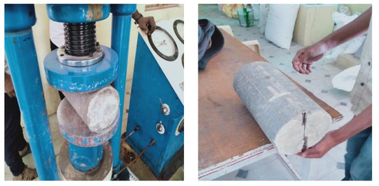 IS 5816 (1999) was utilised to calculate the concrete’s split tensile strength [36]. A cylindrical specimen measuring 150 mm in diameter and 300 mm in height was subjected to the test. As shown in Figure 3, concrete mixtures containing and lacking micro-organisms were loaded to failure. The IS 5816 (1999) formula was utilised to calculate the split tensile strength.