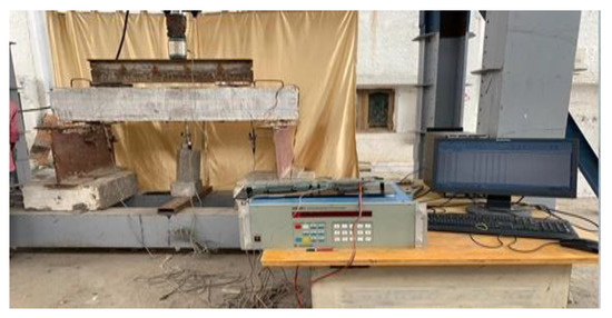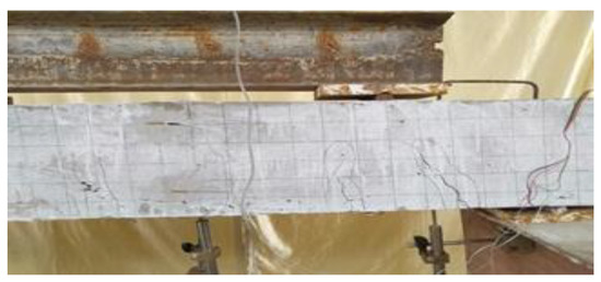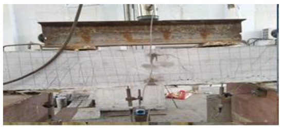 Strain gauges can accurately measure the stress caused by pure bending across the cross section of the beam. A strain gauge was attached with tape to the beam on the simply supported frame arrangement, as depicted in Figure 6. Typically, load cells are used to measure loads in a single direction and are connected to the LVDT via a single channel. On the tension and compression sides of the beam, two strain gauges were installed. Strain gauges coupled to the other two LVDT channels precisely measured the strain value. Weight was gradually added until the first fracture appeared, and then it was gradually increased until failure occurred. Using a strain gauge, the strain values within the channels were recorded.